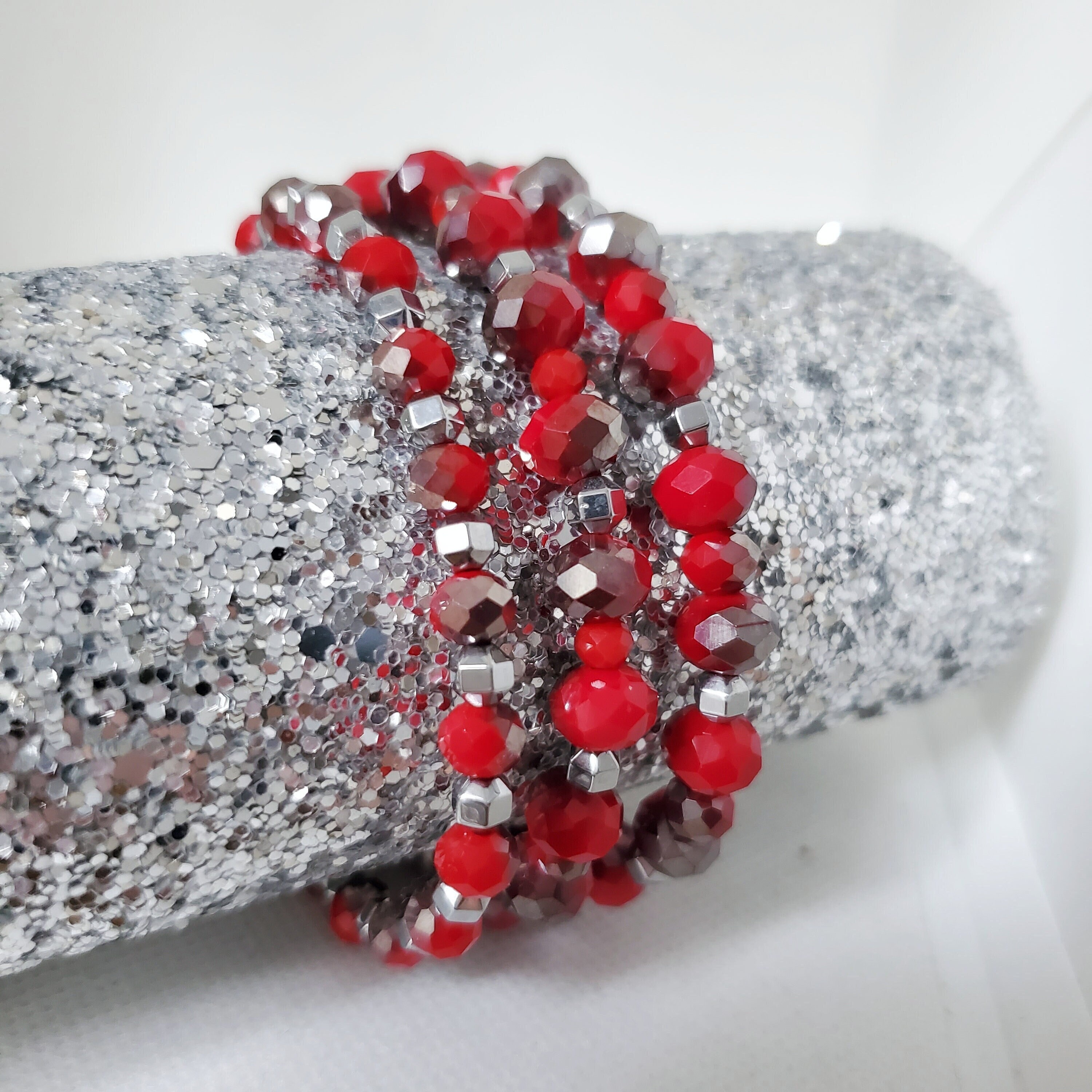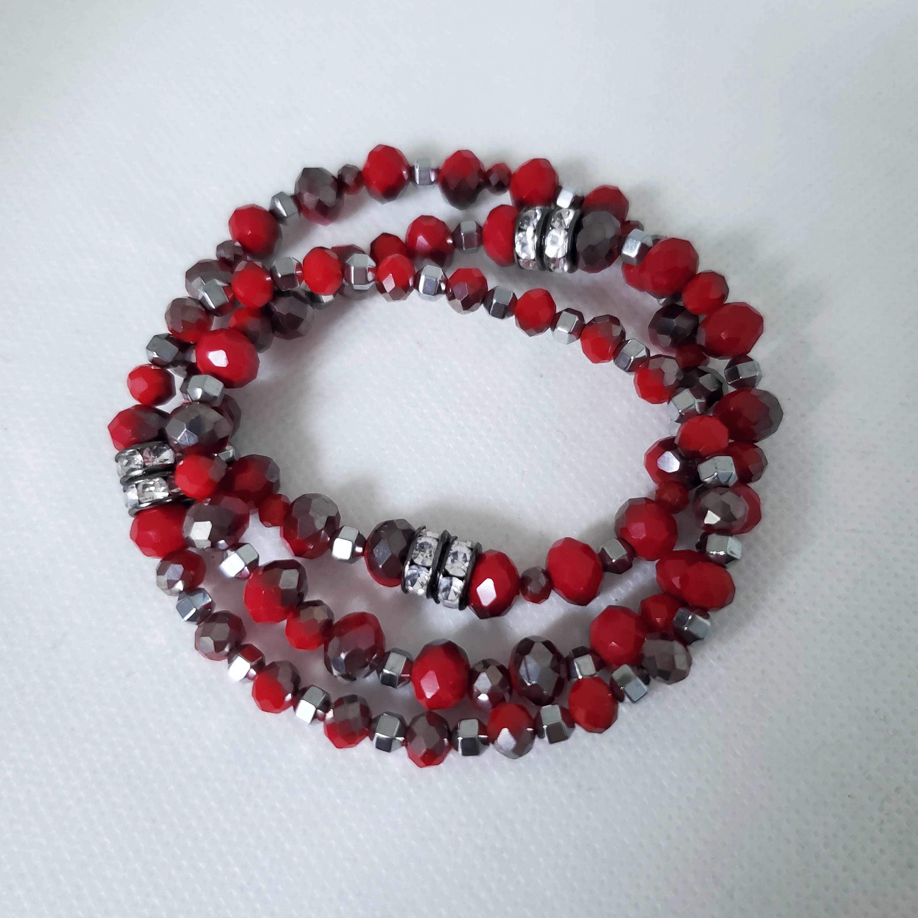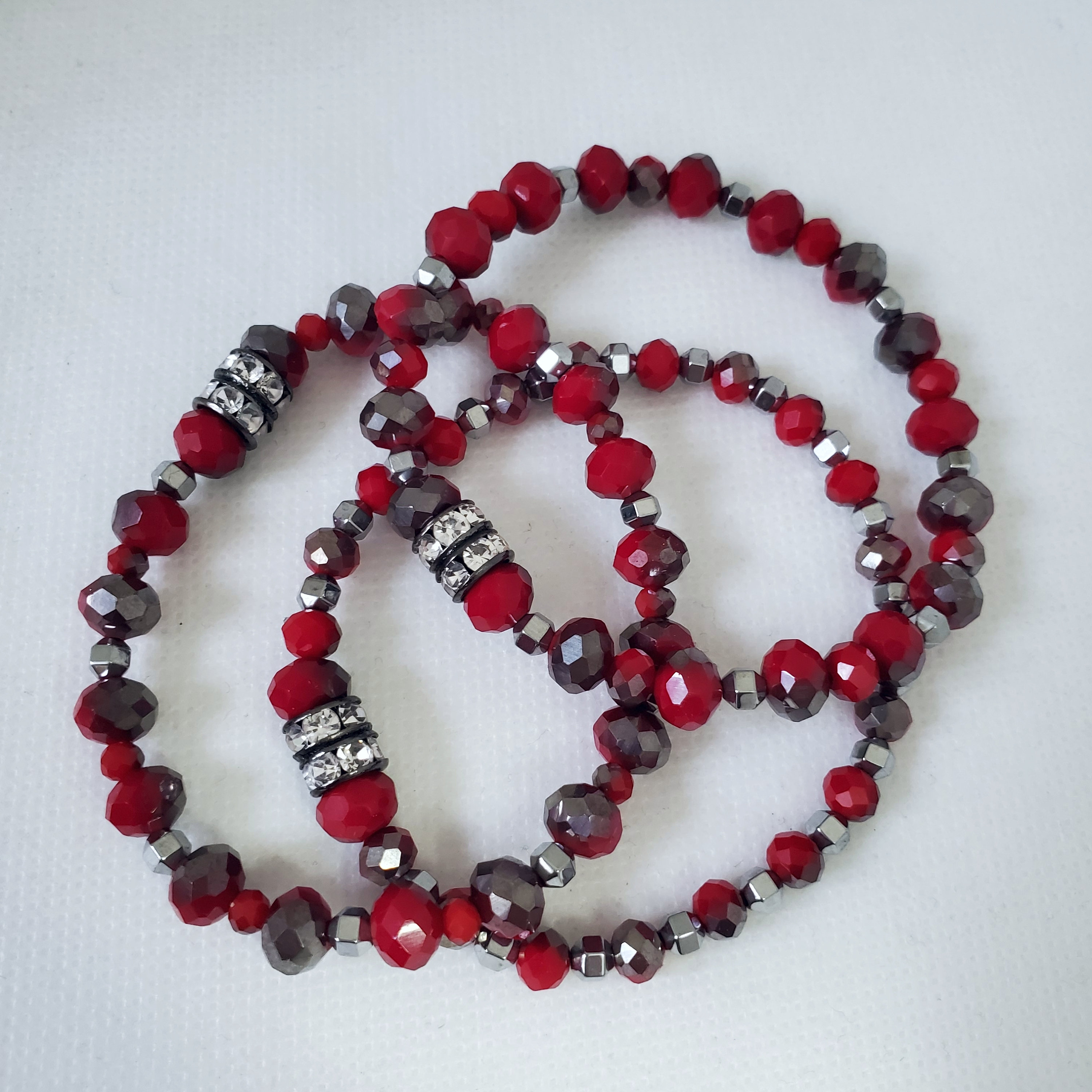 This sparkly bracelet set was made with red faceted crystal beads with shiny metallic accents, paired with genuine hematite faceted beads, and clear glass rhinestone spacers. Bracelets can be worn separately or as a set.